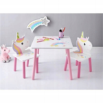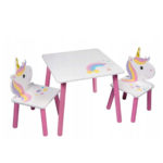Stalas ir kėdės estetiškai dekoruoti spalvingais motyvais.